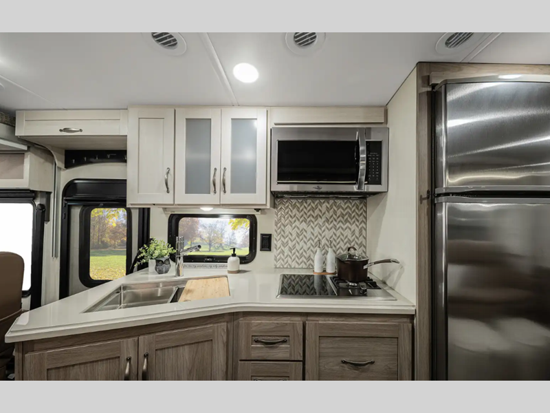 Each model includes an upgraded galley with Corian countertops and ceramic tile backsplash, a king-size bed with storage below, plus sleek dual-pane frameless tinted windows. You will be in control of your coach's functions with the Winnebago Control command center with a 7" touchscreen and available app, and the Winegard 4G LTE Wi-Fi router included means you can stay connected while away from home. The conveniences continue outdoors with a KeyOne lock system, premium full-body paint and protective front mask, plus lighted storage compartments and a power awning with LED lighting!