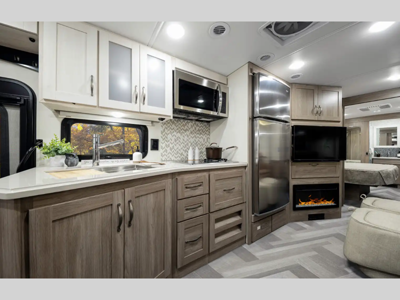 Sleeps 5 Slides 2 Length 35 ft 10 in Ext Width 8 ft 6 in Ext Height 12 ft 1 in Int Height 6 ft 10 in Interior Color Organic Comfort Dark, Organic Comfort Light, Bohemian Oasis Exterior Color Full-Body Paint; Silvermist, Wedgewood ll, Steel Grey, Night Sky Hitch Weight 5000 lbs GVWR 22000 lbs Fresh Water Capacity 74 gals Grey Water Capacity 51 gals Black Water Capacity 63 gals Tire Size 22.5" Furnace BTU 40000 btu Generator 5,500-Watt Cummins Onan Marquis Gold Fuel Type Gas Engine 7.3L V8 Chassis Ford F53 Fuel Capacity 80 gals Wheelbase 228 in Available Beds King Refrigerator Type Stainless Steel Residential with Ice Maker and Water Dispenser Convection Cooking Yes Cooktop Burners 3 Shower Size 36" x 36" Number of Awnings 1 Axle Weight Front 8000 lbs Axle Weight Rear 15000 lbs LP Tank Capacity 76.14 lbs Water Heater Capacity 10 gal Water Heater Type 110V/LP AC BTU 28500 btu Basement Storage 137 cu. ft. TV Info LR 39" HDTV, BR 32" HDTV, Ext. 32" HDTV Awning Info 16' Power w/LED Lighting Washer/Dryer Available Yes Gross Combined Weight 26000 lbs Shower Type Standard Electrical Service 50 amp Similar Floorplans