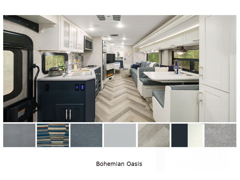Sleeps 5 Slides 2 Length 35 ft 6 in Ext Width 8 ft 6 in Ext Height 12 ft 1 in Int Height 6 ft 10 in Interior Color Organic Comfort Dark, Organic Comfort Light, Bohemian Oasis Exterior Color Full-Body Paint; Silvermist, Wedgewood ll, Steel Grey, Night Sky Hitch Weight 5000 lbs GVWR 22000 lbs Fresh Water Capacity 75 gals Grey Water Capacity 57 gals Black Water Capacity 48 gals Tire Size 22.5" Furnace BTU 40000 btu Generator 5,500-Watt Cummins Onan Marquis Gold Fuel Type Gas Engine 7.3L V8 Chassis Ford F-53 Fuel Capacity 80 gals Wheelbase 228 in Available Beds King Refrigerator Type Stainless Steel Residential with Ice Maker and Water Dispenser Convection Cooking Yes Cooktop Burners 2 Shower Size 34" x 34" Number of Awnings 1 Axle Weight Front 8000 lbs Axle Weight Rear 15000 lbs LP Tank Capacity 76.14 lbs Water Heater Capacity 10 gal Water Heater Type 110V/LP AC BTU 28500 btu Basement Storage 122 cu. ft. TV Info LR 50" HDTV, BR 32" HDTV, Ext. 32" HDTV Awning Info 19' Power w/LED Lighting Washer/Dryer Available Yes Gross Combined Weight 26000 lbs Shower Type Radius Electrical Service 50 amp Similar Floorplans